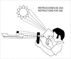 - Heliógrafo: es un dispositivo muy parecido a un espejo ordinario pero con un agujero en medio y un nivel. Su utilización, como es obvio, únicamente se puede llevar a cabo en los días soleados y cuando el sol se encuentre sobre o en frente del observador y el objeto, en caso de que el sol se encuentre a la espalda no se podrá utilizar. Viene con unas instrucciones de uso y su alcance es de hasta 18 millas. Las instrucciones de utilización serán las siguientes: