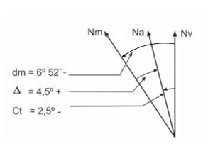 Llamamos corrección total (Ct) a la suma de la declinación magnética y del desvío, es decir, al ángulo que existe entre el norte geográfico o verdadero y el norte de aguja.